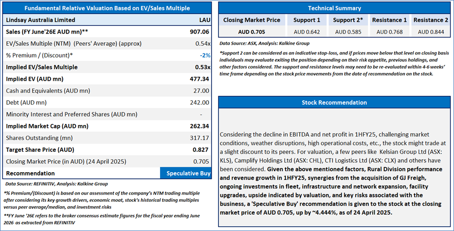 Section 2.0: Lindsay Australia Limited (ASX: LAU) (‘Speculative Buy’ at AUD 0.705, closing market price per share as on 24 April 2025)