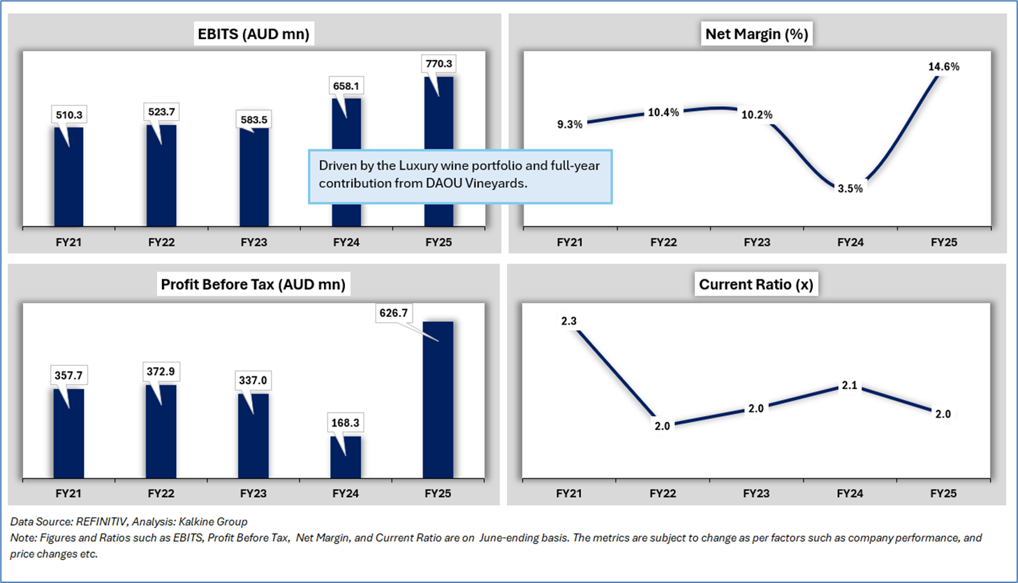 Company Overview: Treasury Wine Estates (ASX: TWE) is one of the world's largest wine companies listed on the Australian Securities Exchange (ASX). The company operates as an end-to-end global wine business focused on producing premium still and sparkling wines for priority markets worldwide. It combines world-class winemaking with brand marketing, managing iconic wine portfolios including divisions such as Penfolds, Treasury Collective, and Treasury Americas. Kalkine’s Daily Report covers the Key Financial Metrics, Risks, Outlook, Technical Analysis along with the Valuation, Target Price, and Recommendation on the stock.