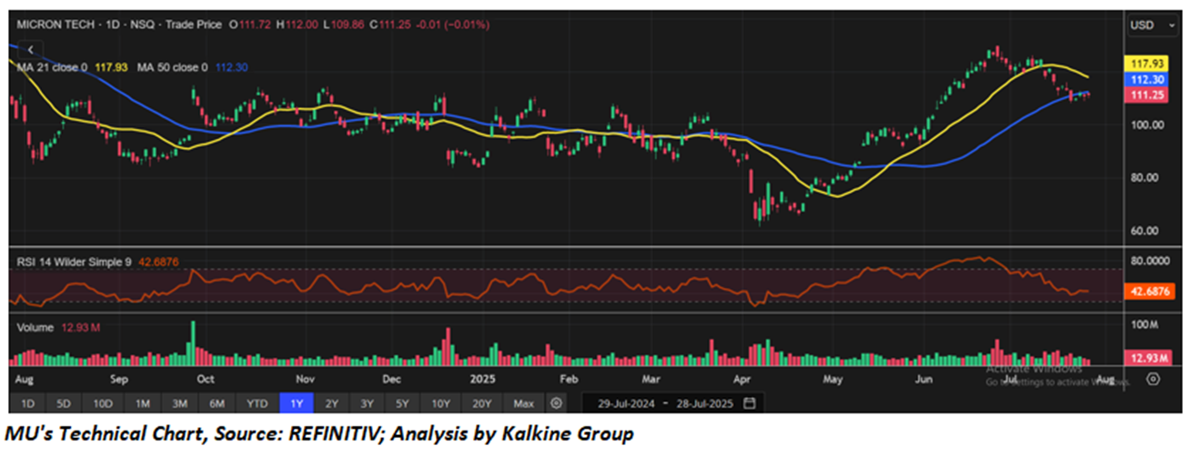 Micron Technology's stock is currently in a short-term pullback after a strong rally earlier this year. The price is trading below its 21-day moving average and the 50-day, indicating a potential shift in momentum. The RSI at 42.7 suggests weakening bullish strength, and moderate volume implies a lack of strong buying or selling pressure.