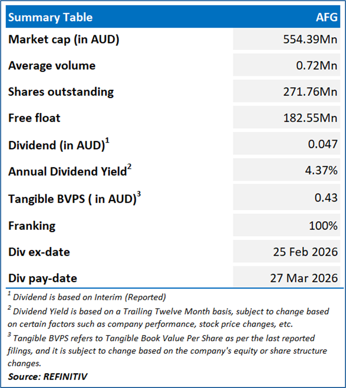 AFG is an ASX listed mortgage broking and financial solutions entity. The Company's principal activities include mortgage origination and lending.
