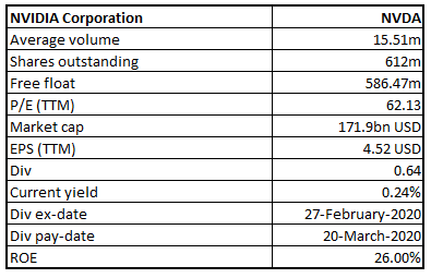 Stock Recommendation: The stock of NVDA closed at $280.84 with a market capitalization of $171.9 billion. The stock made a 52-week low and high of $132.60 and $316.32 and is currently trading towards the upper band of the trading range. The stock has delivered a decent return of ~49.4% in the last one year. Looking at the 1-month price movement, the stock has gained ~43%, outperforming the broader indices. The company further expects data-centers to continue its growth impetus in the coming quarter. We have valued the stock using P/CF multiple based illustrative relative valuation method and arrived at correction of higher single-digit (in % terms). For the purpose, we have taken peers like Intel Corp (NASDAQ: INTC), Texas Instruments Inc (NASDAQ: TXN), Advanced Micro Devices Inc (NASDAQ: AMD), to name few. Considering the fundamentals, returns on the stock, current trading levels and valuation, we are of the view that most of the positive factors have been discounted at the current levels. Hence, with this view, we suggest investors to book profits and give a “Sell” recommendation on the stock at the current market price of $280.84, down 1.1% on 15th April 2020.