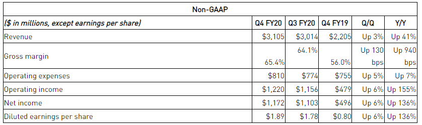 4QFY20 Key Financial Highlights: During the period, the company reported revenues of $3,105 million, up 41% year over year. Non-GAAP earnings for 4QFY20 stood at $1.89 per share, up 136% year over year. The bottom-line also soared by 6% on a quarter over quarter basis. In 4QFY20, revenues from GPU increased 40% on pcp and came in at $2.77 billion. Revenue from Tegra Processor business stood at $331 million, up 47% year over year. During the period, non-GAAP gross margin expanded 940 basis points (bps) on pcp and came in at 65.4%, depicting the enhanced impact of Data Center products and lower inventory charges in Gaming. Non-GAAP operating income stood at $1.22 billion, up 155% on pcp. At the end 26 January 2020, the company’s cash balance stood at $10,897 million, with debt amounting to $1,991 million.