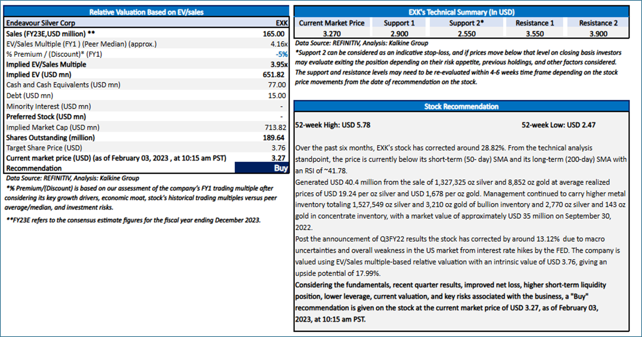 Section 2: Endeavour Silver Corporation (“BUY” at the current market price of USD 3.27 as of February 03, 2023, at 10:15 am PST)