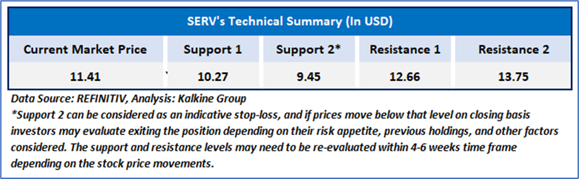 SERV's stock price has established support at key levels and has been trending higher, with expectations of continued upward movement in the near term. The 14-period RSI is rising above the midpoint, suggesting that bullish momentum could strengthen soon, supporting a optimistic outlook. Furthermore, the stock regained its 50-period simple moving average, which adds to the bullish sentiment. Overall, these technical signals indicate a higher likelihood of upward movement, provided the price stays above these essential support levels.