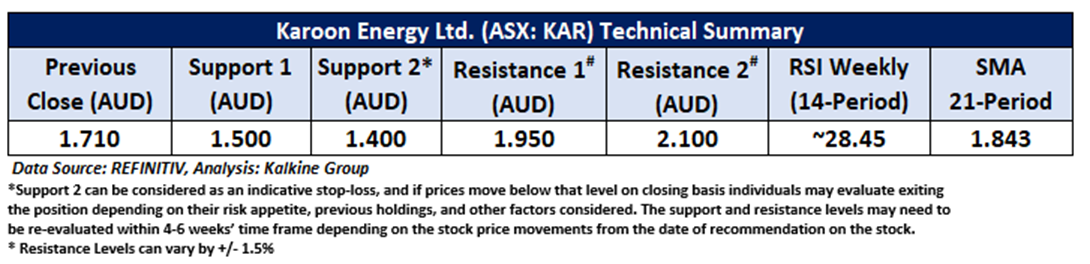 On the daily chart, KAR prices are trading above the horizontal trendline support zone. Moreover, the momentum oscillator RSI (14-period) is showing a reading of ~28.45 level. However, the prices are trading below the trend-following indicator 21-period SMA, which may act as a resistance level. An important support level for the stock is placed at AUD 1.50, while the key resistance level is placed at AUD 1.95.