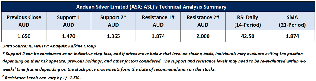 Company Overview: Andean Silver Limited (ASX: ASL) develops and explores for mineral properties, which holds 100% interest in its flagship project Cerro Bayo Silver-Gold project comprising approximately 70 contiguous exploration concessions that covers an area of 285 square kilometres located in the Aysen region of Southern Chile. This Report covers the Price Action, Technical Indicators Analysis along with the Support Levels, Resistance Levels, and Recommendations on this stock.