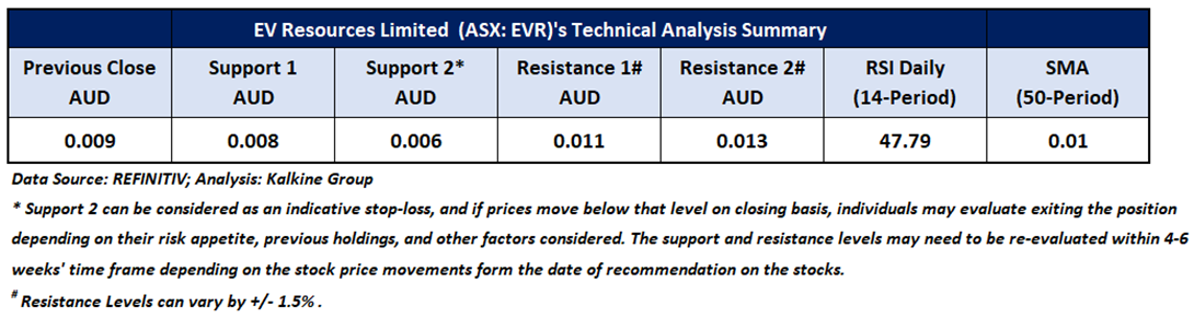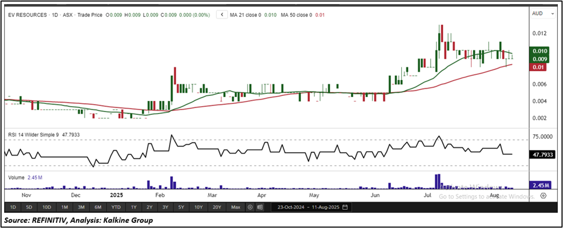 Considering the stock’s current price levels forming a trading range, and momentum oscillator analysis, a “Watch” recommendation is given on the stock. The stock was analysed as per the closing price of AUD 0.009 per share as on 11 August 2025, remained unchanged. EV Resources Limited (ASX: EVR) was last covered in a report dated ’26 May 2023’.