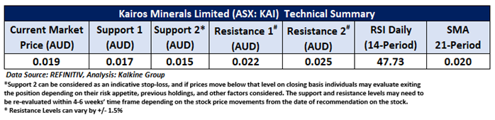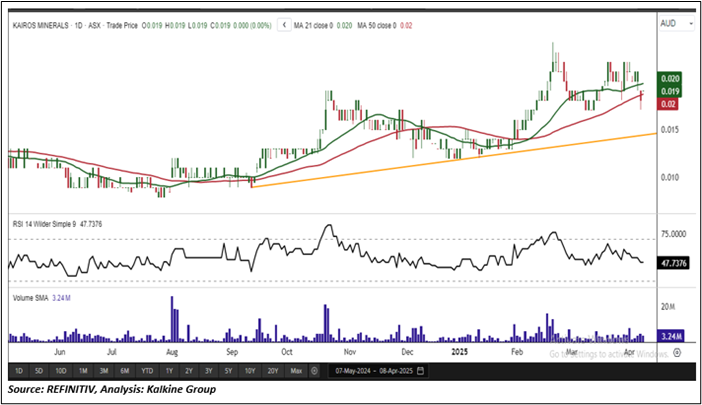 Considering the stock’s current price levels forming higher peaks and higher troughs, and momentum oscillator analysis, a “Speculative Buy” recommendation is given on the stock. The stock was analysed as per the current price of AUD 0.019 per share as on 08 April 2025 at 2:20 PM AEST. Kairos Minerals Limited (ASX: KAI) was last covered in a report dated ’05 March 2025’.
