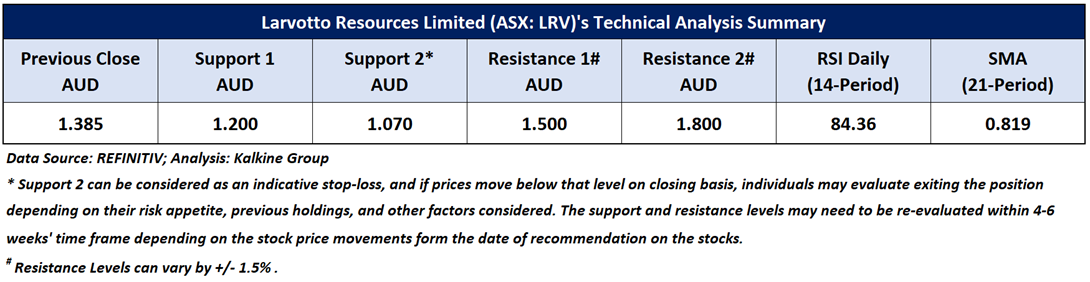 Company Overview: Larvotto Resources Limited (ASX: LRV) engages in the acquisition, exploration, evaluation, and development of mineral resources in Australia and New Zealand, exploring for gold, antimony, copper, cobalt, rare earths, PGE, lithium, and nickel deposits. This Report covers the Price Action, Technical Indicators Analysis along with the Support Levels, Resistance Levels, and Recommendations on this stock.