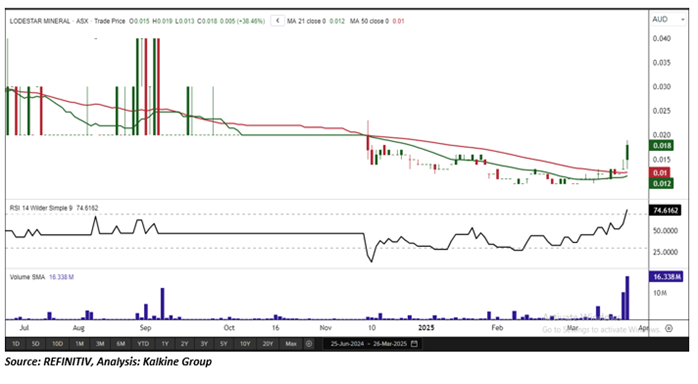 Considering the stock’s current price levels surpassing its previous peak, and momentum oscillator analysis, a “Speculative Buy” recommendation is given on the stock. The stock was analysed as per the closing price of AUD 0.018 per share as on 26 March 2025, up by 38.46%. Lodestar Minerals Limited (ASX: LSR) was last covered in a report dated ’03 May 2022’.