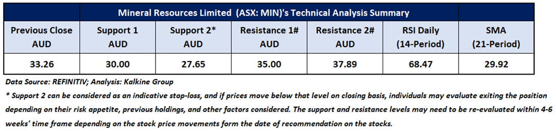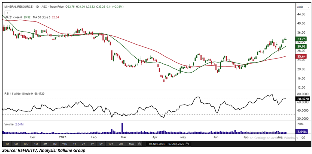 Considering the stock’s current price levels surpassing the neckline of an Inverse head and shoulders pattern, and momentum oscillator analysis, a “Watch” recommendation is given on the stock. The stock was analysed as per the closing price of AUD 33.26 per share as on 07 August 2025, up by 0.33%. Mineral Resources Limited (ASX: MIN) was last covered in a report dated ’18 July 2025.’