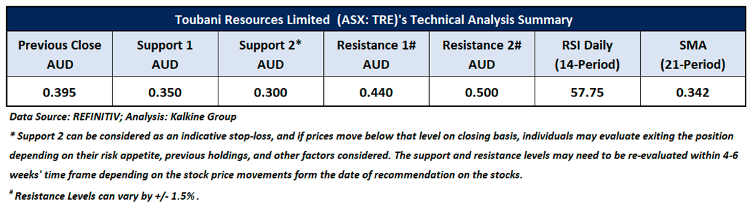 Company Overview: Toubani Resources Limited (ASX: TRE) engages in the exploration and development of gold properties in West Africa, focusing on the Kobada Gold project located in Southern Mali. This Report covers the Price Action, Technical Indicators Analysis along with the Support Levels, Resistance Levels, and Recommendations on this stock.