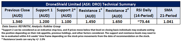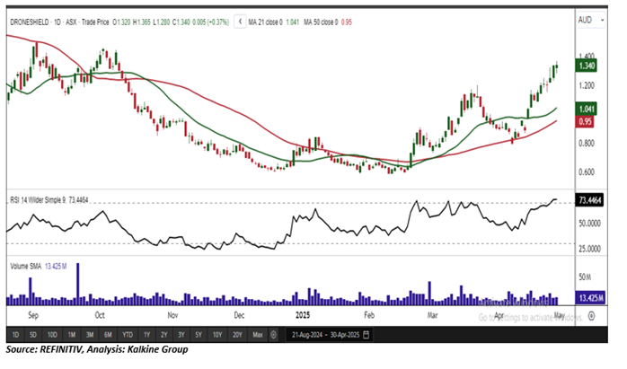 Considering the stock’s current price levels breaking its previous peak during an uptrend, and momentum oscillator analysis, a “Speculative Buy” recommendation is given on the stock. The stock was analysed as per the closing price of AUD 1.340 per share as on 30 April 2025, up by 0.37%. DroneShield Limited (ASX: DRO) was last covered in a report dated ’07 March 2025’.