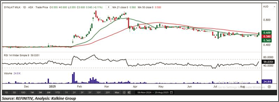 Considering the stock’s current price levels breaking above the upper boundary of a descending wedge pattern, and momentum oscillator analysis, a “Speculative Buy” recommendation is given on the stock. The stock was analysed as per the closing price of AUD 0.600 per share as on 20 August 2025, up by 8.11%. Synlait Milk Limited (ASX: SM1) was last covered in a report dated ’06 December 2022’.