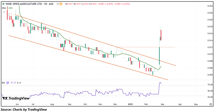 Considering the stock’s current price levels breaking above a downward slope channel, and momentum oscillator analysis, a “Speculative Buy” recommendation is given on the stock. The stock was analysed as per the closing price of AUD 0.014 per share as on 27 February 2025, down by 6.67%. Wide Open Agriculture Limited (ASX: WOA) was last covered in a report dated ’17 November 2021’.
