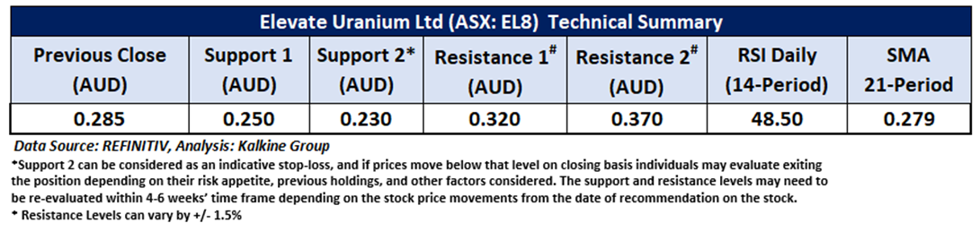 Company Overview: Elevate Uranium Ltd (ASX: EL8) is a uranium exploration and development company with key projects in Namibia and Australia. The company holds a 75% interest in the Marenica uranium project in Namibia, one of its flagship assets. This Report covers the Price Action, Technical Indicators Analysis along with the Support Levels, Resistance Levels, and Recommendations on this stock.