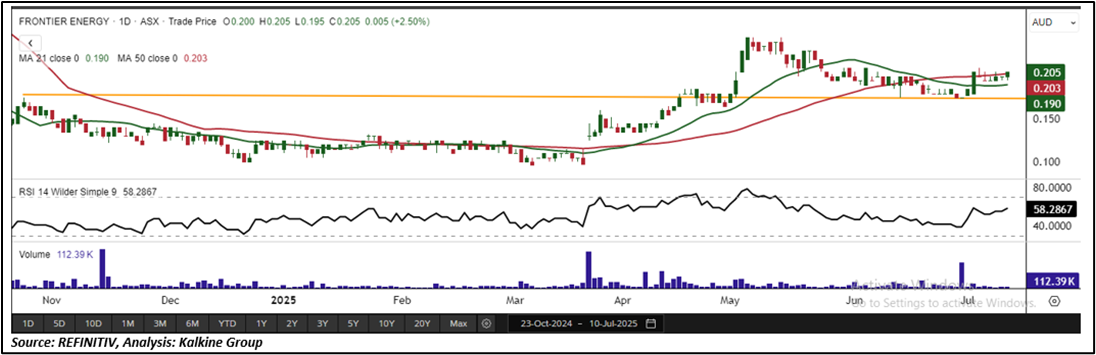 On the daily chart, FHE is displaying bullish technical signals. The stock is trading above a horizontal trendline support, indicating the potential for sustained upward momentum. The 14-period Relative Strength Index (RSI) is currently around 58.28, reflecting healthy buying strength. In addition, the price remains above the 21-period Simple Moving Average (SMA), a key trend-following indicator that further supports the prevailing bullish sentiment. Immediate support for the stock is seen at AUD 0.180, while key resistance is identified at AUD 0.230.