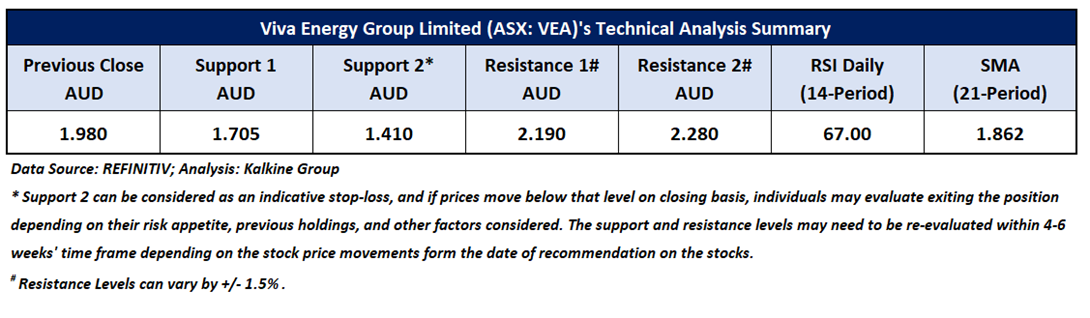 Company Overview: Viva Energy Group Limited (ASX: VEA) operates as an energy company in Australia, Singapore, and Papua New Guinea, comprising three segments: Convenience & Mobility, Commercial & Industrial, and Energy & Infrastructure. This Report covers the Price Action, Technical Indicators Analysis along with the Support Levels, Resistance Levels, and Recommendations on this stock.