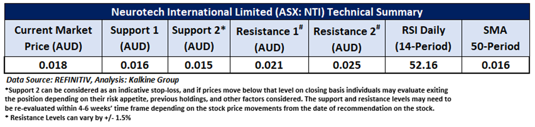 Company Overview: Neurotech International Limited (ASX: NTI) is a clinical-stage biopharmaceutical company based in Australia that focuses on the research, design, development, and production of innovative medical devices and therapeutic solutions. This Report covers the Price Action, Technical Indicators Analysis along with the Support Levels, Resistance Levels, and Recommendations on this stock.