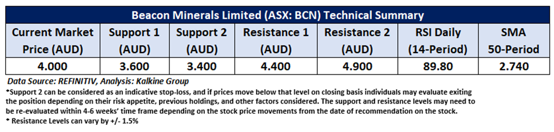 On the daily chart, BCN is trading above a key rising support zone, indicating price stability and sustained buying interest. The 14-period Relative Strength Index (RSI) is around 89.80, highlighting strong bullish momentum, though it remains in the overbought zone and may warrant caution. The stock also continues to trade above the 21-period Simple Moving Average (SMA), which is providing dynamic support and reinforcing the prevailing uptrend. Key technical levels to monitor include support at AUD 3.60 and resistance at AUD 4.40. A decisive breakout above the resistance level could pave the way for further upside potential.