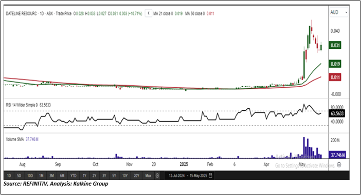Considering the stock’s current price levels are trading above the horizontal trendline support, and momentum oscillator analysis, a “Speculative Buy” recommendation is given on the stock. The stock was analysed as per the current market price of AUD 0.031 per share as on 15 May 2025 at 2:55 PM AEST, up by 10.71%.