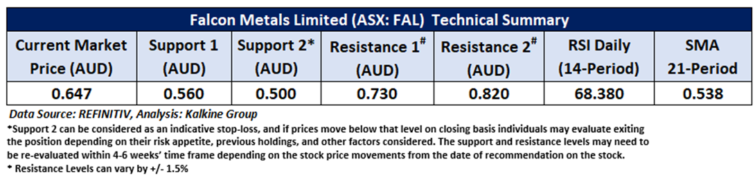 Company Overview: Falcon Metals Limited (ASX: FAL) is a gold exploration company based in Australia. Its projects include Pyramid Hill Gold, Viking, and Mount Jackson Projects. This Report covers the Price Action, Technical Indicators Analysis along with the Support Levels, Resistance Levels, and Recommendations on this stock.