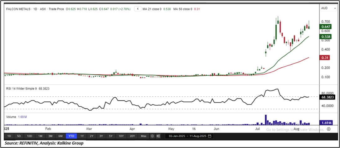 On the daily chart, FAL is trading above a rising trendline support, signalling the potential for further upside. The 14-period Relative Strength Index (RSI) stands at 68.38, indicating strong buying momentum. Additionally, the price remains above the 21-period Simple Moving Average (SMA), a key trend-following indicator that reinforces the prevailing bullish outlook. Crucial support for the stock is positioned at AUD 0.560, while key resistance is placed at AUD 0.730.