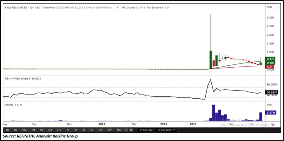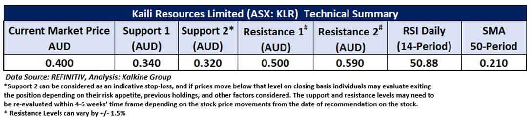 On the daily chart, KLR is trading above its horizontal trendline support level, signalling price stability. The 14-period Relative Strength Index (RSI) stands at 50.88, suggesting healthy bullish momentum. Moreover, the stock is holding above its 50-period Simple Moving Average (SMA), which continues to act as dynamic support and reinforces the prevailing uptrend. Key price levels include critical support at AUD 0.340 and major resistance at AUD 0.500.