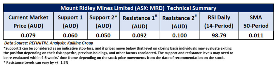 Company Overview: Mount Ridley Mines Limited (ASX: MRD) is an Australia-based exploration company focused on demand-driven metals within Western Australia. The company’s flagship asset, the Mount Ridley Rare Earth Element (REE) Project, is located approximately 50 kilometers northeast of the Port of Esperance and spans an area of around 3,400 square kilometers. This strategic project positions the company to capitalize on the growing global demand for critical minerals. This Report covers the Price Action, Technical Indicators Analysis along with the Support Levels, Resistance Levels, and Recommendations on this stock.