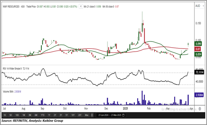 On the daily chart, NIM is holding above its horizontal trendline breakout level, suggesting price stability. The 14-period Relative Strength Index (RSI) currently reads 72.11, highlighting strong bullish momentum. Additionally, the stock continues to trade above the 21-period Simple Moving Average (SMA), which serves as dynamic support and reinforces the prevailing uptrend. Key levels to watch include critical support at AUD 0.080 and major resistance at AUD 0.105.