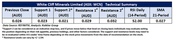 Considering the stock’s current price levels are trading above the falling trendline support zone, and momentum oscillator analysis, a “Speculative Buy” recommendation is given on the stock. The stock was analysed as per the closing price of AUD 0.026 per share as on 29 May 2025, up by 4.00%. White Cliff Minerals Limited (ASX: WCN) was last covered in a report dated ’06 November 2020’.