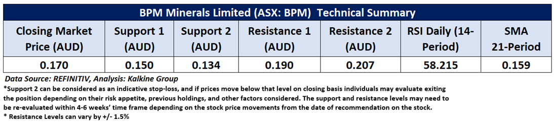 On the daily chart, BPM continues to trade above its rising trendline support zone, signalling sustained positive momentum. The 14-period RSI is hovering near 58.21, indicating stable underlying strength. Prices also remain above the 21-period Simple Moving Average (SMA), which is acting as dynamic support and may help cushion near-term pullbacks. A critical support level is positioned at AUD 0.134, while key resistance is seen near AUD 0.207.