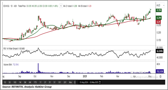 On the daily chart, EIQ is trading above a rising trendline support zone, signalling ongoing price stability and trend strength. The 14-period Relative Strength Index (RSI) is currently around 66.84, suggesting moderate bullish momentum without yet reaching overbought conditions. Additionally, the stock is positioned above the 50-day Simple Moving Average (SMA), which serves as a dynamic support level and further supports the prevailing upward trend. Key price levels to watch include a significant support at AUD 0.320 and a major resistance at AUD 0.374.