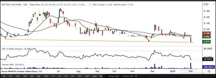 Company Overview: Battery Age Minerals Ltd (ASX: BM8) is an Australia-based mineral exploration company focused on the exploration of battery minerals, such as lithium, copper, germanium and zinc in Canada, Morocco and Austria. This Report covers the Price Action, Technical Indicators Analysis along with the Support Levels, Resistance Levels, and Recommendations on this stock.