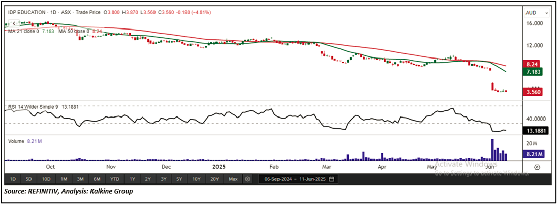 Considering the stock’s current price levels undergoing a downtrend, and momentum oscillator analysis, a “Watch” recommendation is given on the stock. The stock was analysed as per the closing price of AUD 3.56 per share as on 11 June 2025, down by 4.81%. IDP Education Limited (ASX: IEL) was last covered in a report dated ’30 January 2025’.