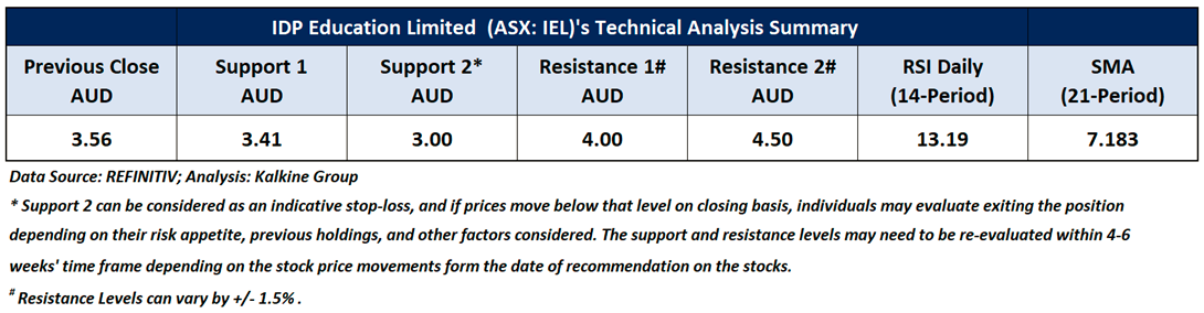 Company Overview: IDP Education Limited (ASX: IEL) engages in the placement of students into education institutions, including counselling, application processing, pre-departure guidance, student placement and examinations, English language teaching, client relations, online student recruitment in Australia, the United Kingdom, the United States, Canada, New Zealand, and Ireland. This Report covers the Price Action, Technical Indicators Analysis along with the Support Levels, Resistance Levels, and Recommendations on this stock.