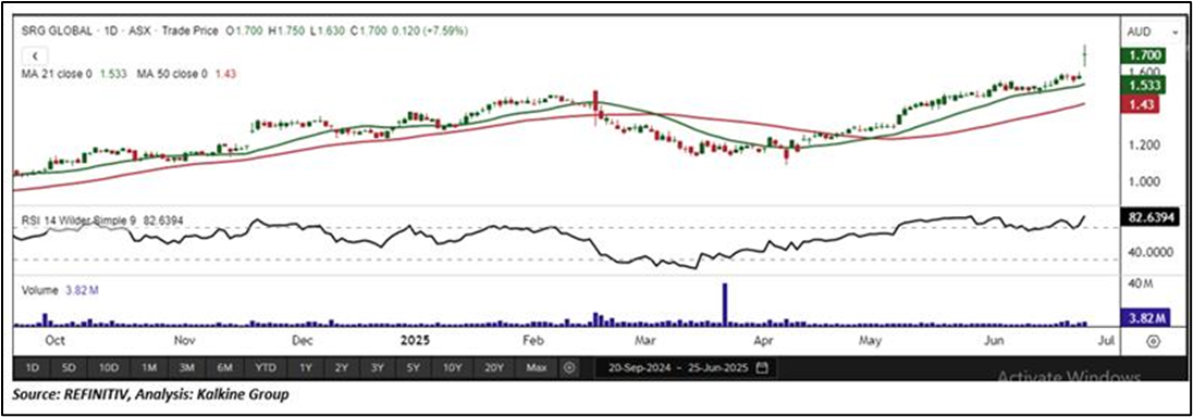 Considering the stock’s current price levels forming higher peaks and higher troughs, and momentum oscillator analysis, a “Watch” recommendation is given on the stock. The stock was analysed as per the closing price of AUD 1.700 per share as on 25 June 2025, up by 7.59%. SRG Global Limited (ASX: SRG) was last covered in a report dated ’14 February 2024’.