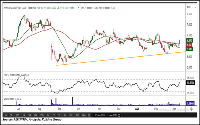 Considering the stock’s current price levels are trading above the rising trendline support, and momentum oscillator analysis, a “Speculative Buy” recommendation is given on the stock. The stock was analysed as per the closing price of AUD 6.270 per share as on 11 March 2025, up by 2.45%. Yancoal Australia Limited (ASX: YAL) was last covered in a report dated ’08 April 2024’.