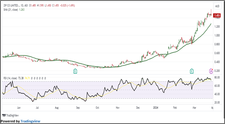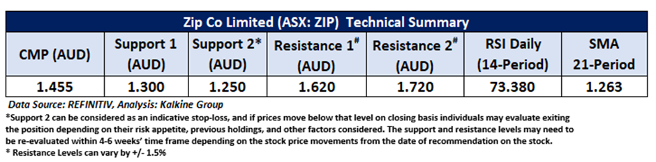 On the daily chart, ZIP prices are sustaining above the horizontal trendline resistance zone and taking support from the same. Moreover, the momentum oscillator RSI (14-period) is showing a reading of ~73.38 level. Further, the prices are trading above the trend-following indicator 21-period SMA, which may act as support zone. An important support level for the stock is placed at AUD 1.30, while the key resistance level is placed at AUD 1.62.
