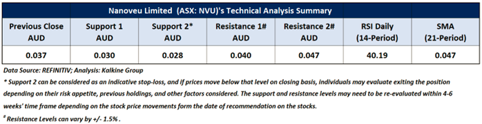 Company Overview: Nanoveu Limited (ASX: NVU) develops and sells nanotechnology applications for consumer devices in the Americas and Asia, providing Nanoshield, an antiviral protector, which is available in various mobile phone screen covers and cases, as well as a commercial film for various surface applications. This Report covers the Price Action, Technical Indicators Analysis along with the Support Levels, Resistance Levels, and Recommendations on this stock.