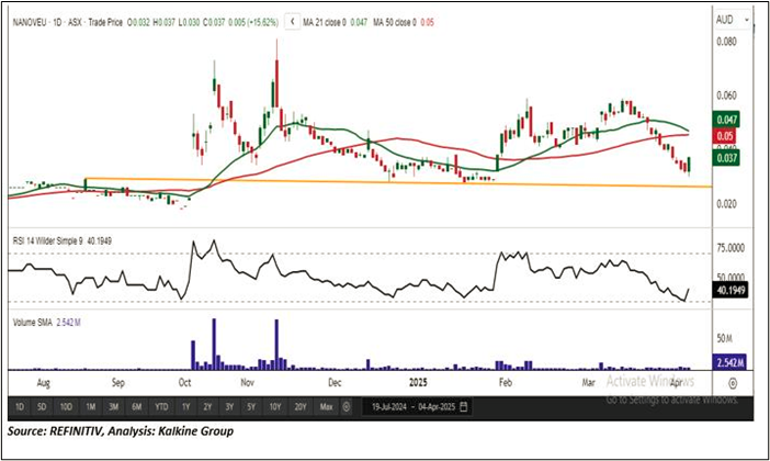 Considering the stock’s current price levels forming higher peaks and higher troughs, and momentum oscillator analysis, a “Speculative Buy” recommendation is given on the stock. The stock was analysed as per the closing price of AUD 0.037 per share as on 04 April 2025, up by 15.62%.