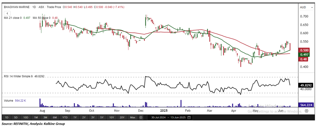 Considering the stock’s current price levels forming higher peaks and higher troughs, and momentum oscillator analysis, a “Speculative Buy” recommendation is given on the stock. The stock was analysed as per the closing price of AUD 0.500 per share as on 13 June 2025, down by 7.41%. Bhagwan Marine Limited (ASX: BWN) was last covered in a report dated ’02 July 2024’.
