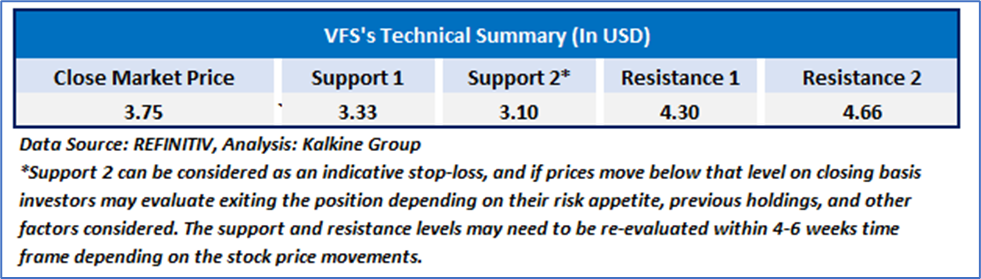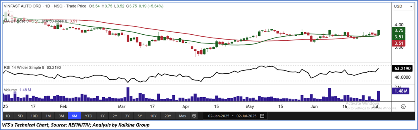VFS’s stock price found support at key levels and gradually moved higher, showing early indications of a potential upward trend in the near term. The 14-period RSI is starting to trend upward, reflecting growing buying interest at current levels. Additionally, the stock has regained its 21-day and 50-day Simple Moving Averages, reinforcing support for its near-term price stability. Daily trading volumes also bolster a bullish outlook on the stock.