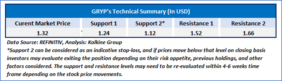 GRYP's stock price is currently hovering around key support levels and may experience an upward move in the near term. The 14-period RSI remains above the midpoint, indicating sustained positive momentum and supporting a bullish outlook. Furthermore, the stock is trading above its 21 level and the 50-period Simple Moving Average, which could act as additional support levels in the short term. The combination of these technical indicators suggests that the stock has the potential for further upside, provided it maintains these support zones.