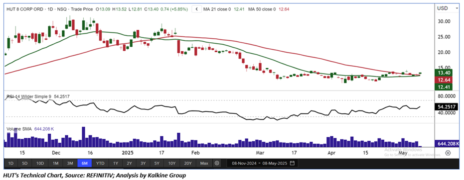 As per the above-mentioned price action, recent key business and financial updates, momentum in the stock over the last month, and technical indicators analysis, a ‘Speculative Buy’ rating has been given to Hut 8 Corp. (NASDAQ: HUT) at its current market price of USD 13.40 as of May 8, 2025 (7:00 am PDT)