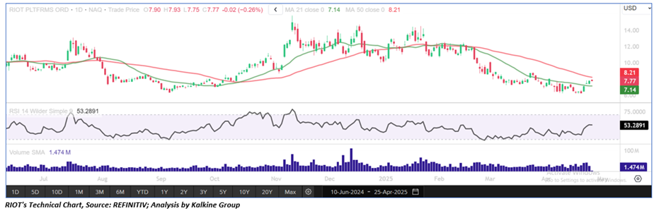 As per the above-mentioned price action, recent key business and financial updates, momentum in the stock over the last month, and technical indicators analysis, a ‘Buy’ rating has been given to Riot Platforms, Inc. (NASDAQ: RIOT) at its current market price of USD 7.77 as of April 25, 2025, (6:45 am PDT).