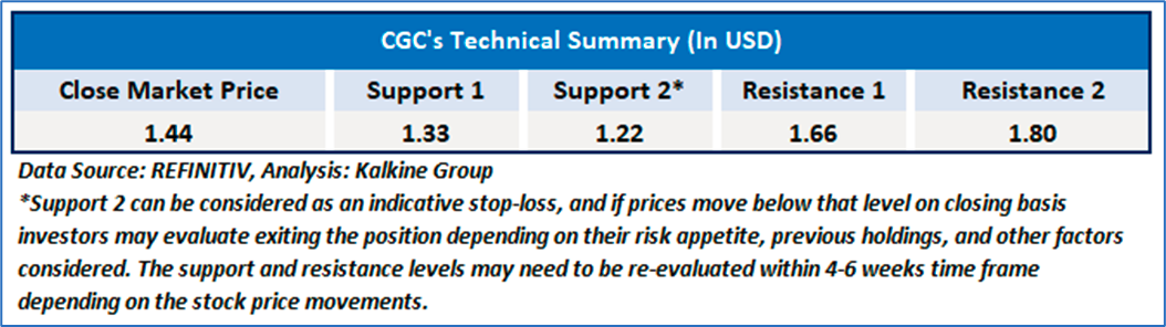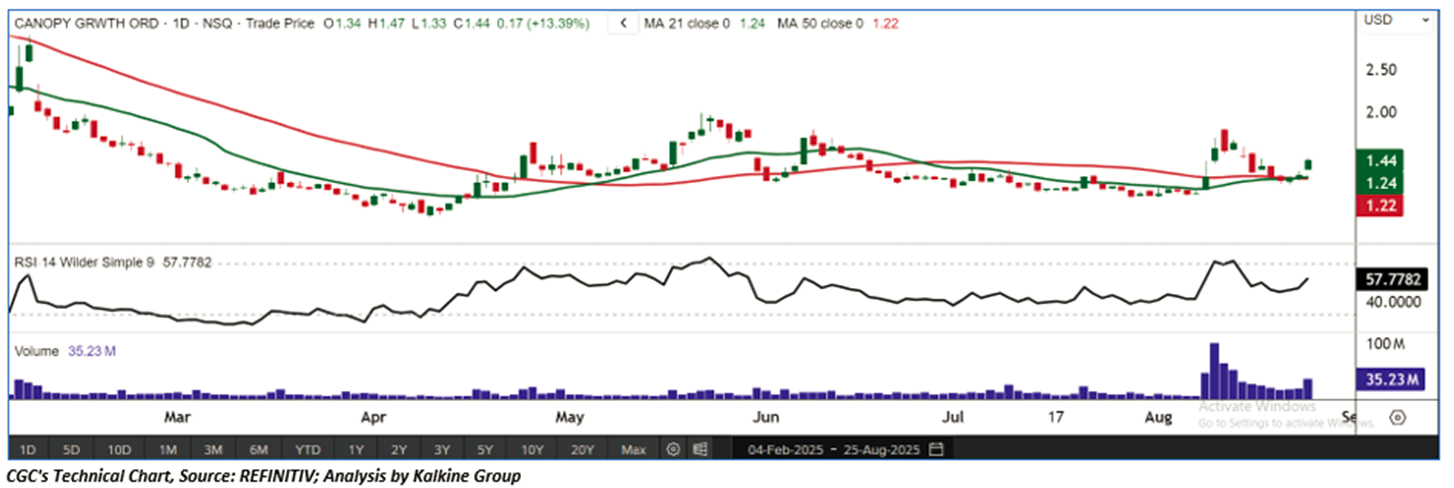 As per the above-mentioned price action, recent key business and financial updates, momentum in the stock over the last month, and technical indicators analysis, a ‘Speculative Buy’ rating has been given to Canopy Growth Corporation (NASDAQ: CGC) at its close market price of USD 1.44 as of Aug 25, 2025.
