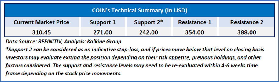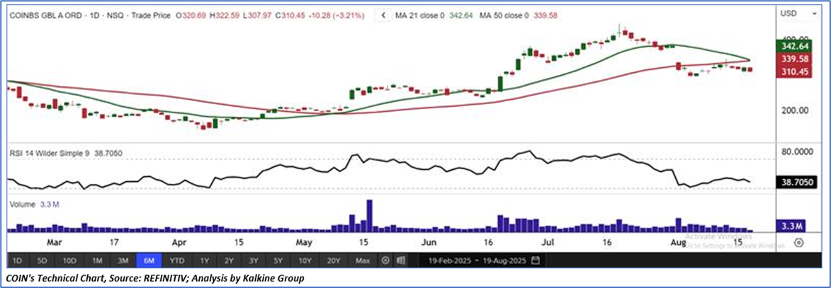 COIN's stock price encountered resistance at important levels and declined, indicating potential for further downside before possibly consolidating and resuming its upward trend. The 14-period RSI remains below the midpoint, signaling a possible phase of sideways movement. Additionally, the stock has fallen below its 50-period simple moving average, reinforcing the negative outlook. Ultimately, the stock’s future direction will heavily rely on these critical support and resistance levels, as they will shape the supply and demand forces influencing its price action.