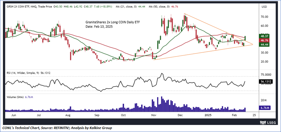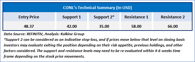 CONL's stock has recently broken out of a symmetrical triangle pattern, indicating the possibility of further short-term gains. This optimistic view is supported by the 14-day Relative Strength Index (RSI), which has climbed above 50, signalling growing buying momentum. Additionally, the CONL’s price has regained its position above the 21-day Simple Moving Average (SMA), likely serving as a short-term support level. In the near term, key support and resistance levels will function as potential demand and supply zones.