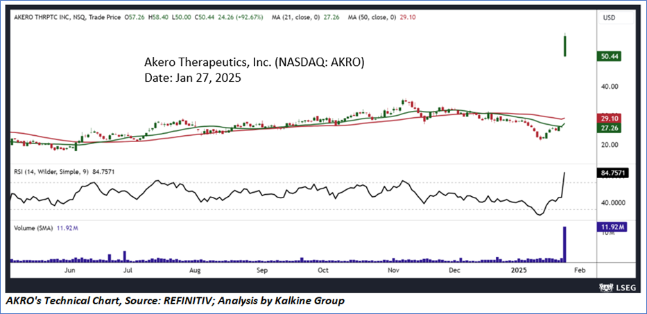 As per the above-mentioned price action, recent key business and financial updates, momentum in the stock over the last month, and technical indicators analysis, a ‘Watch’ rating has been given to Akero Therapeutics, Inc. (NASDAQ: AKRO) at its current market price of USD 50.44 as of Jan 27, 2025 (12:15 am EST).